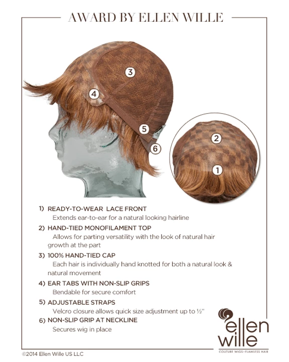 Together the 100% hand-tied cap, lace front and monofilament top give this wig a very natural look. It is ideal for a petite to average head size. The 100% Remy human hair is the finest quality human hair — exceptionally strong yet soft, shiny and less likely to tangle as the cuticle is still intact and aligned. Award is part of the Ellen Wille Pure collection.