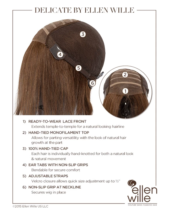 Delicate by Ellen Wille is an expertly cut bob that can be styled classic or extremely modern. The 100% Remy Human Hair can be styled super straight or with curved ends. The hand-made lace front and monofilament top are made of sheer lace to blend with all skin tones. The 100% hand-tied cap was designed to give you natural movement with styling options and a comfortable feel.