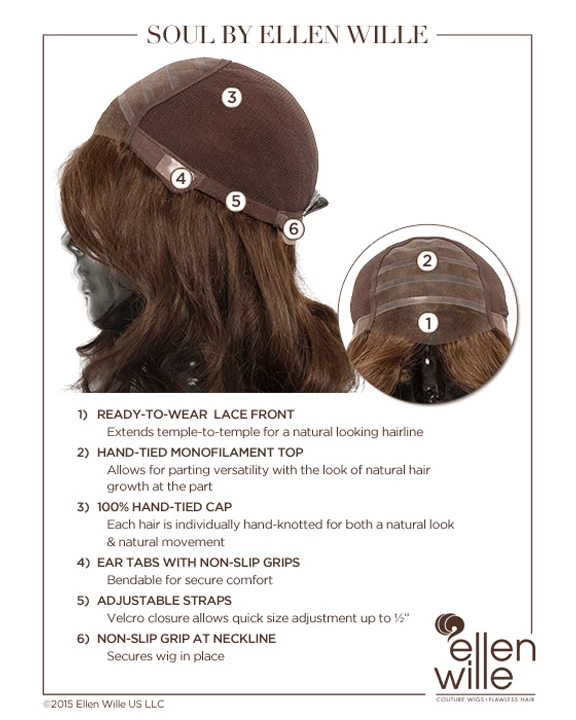 Soul by Ellen Wille is a long, curly human hair wig with fullness and body. The hand-made lace front and monofilament top blend in with all skin tones and create a scalp appearance. The 100% Remy Human Hair is pre-curled and will create fullness once styled. You can style the hair straight, curly, or wavy. The hand-tied sides and back are carefully constructed to give you movement with an exceptionally natural look.