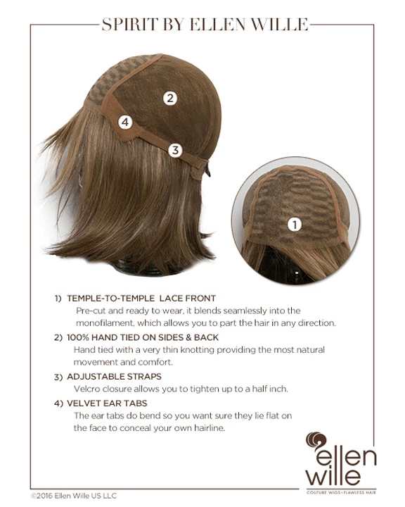 Spirit by Ellen Wille is a sophisticated yet playful mid-length bob. The Spirit is created with Ellen Wille’s new and innovative Prime Hair. Prime hair is a proprietary composition of Human Hair enhanced with Premium Synthetic fiber which allows for longer lasting vibrancy of the colors. Prime hair is also stylable and due to the premium synthetic fiber (which withstands heat up to 350), any style you give these wigs will hold much longer and even through washings! This is workmanship at its finest creating the perfect wig wearing experience. Featuring a very thin hand-knotting, the Spirit provides a new innovative lace front that seamlessly blends into the front part, replacing the well known monofilament. The soft and caressing hair provides a great sense of well-being and is unmatched with its versatility in styling. The cap is adjustable and lightweight, providing comfort with a custom fit. Spirit is part of the Ellen Wille Prime Power collection.