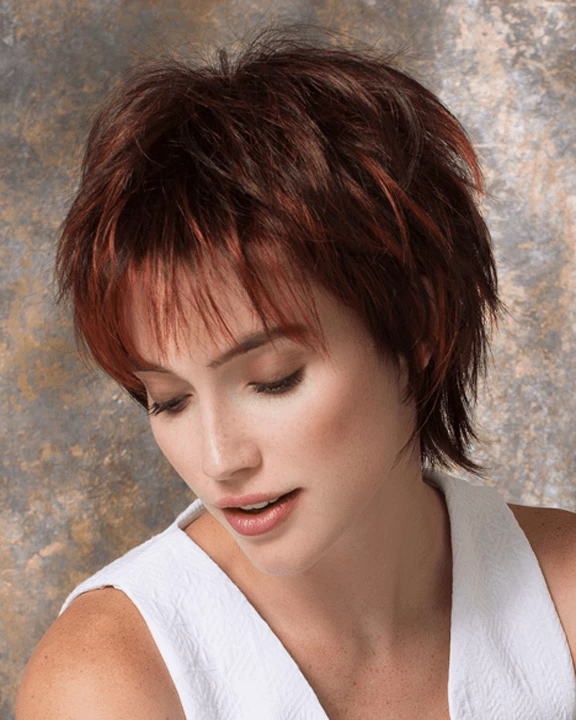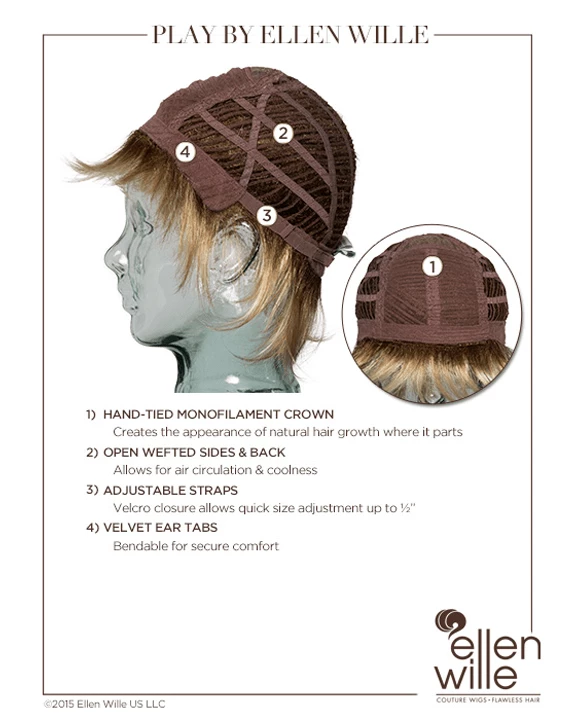 Play by Ellen Wille is straight, choppy, and layered to frame the face. The monofilament crown is hand-tied and located where the hair naturally parts. The open wefted cap is designed to allow air to flow through, keeping your wig light and cool all day. This synthetic wig is expertly cut to bring out the most of the style and choppy layers.