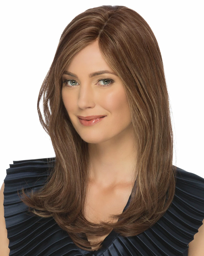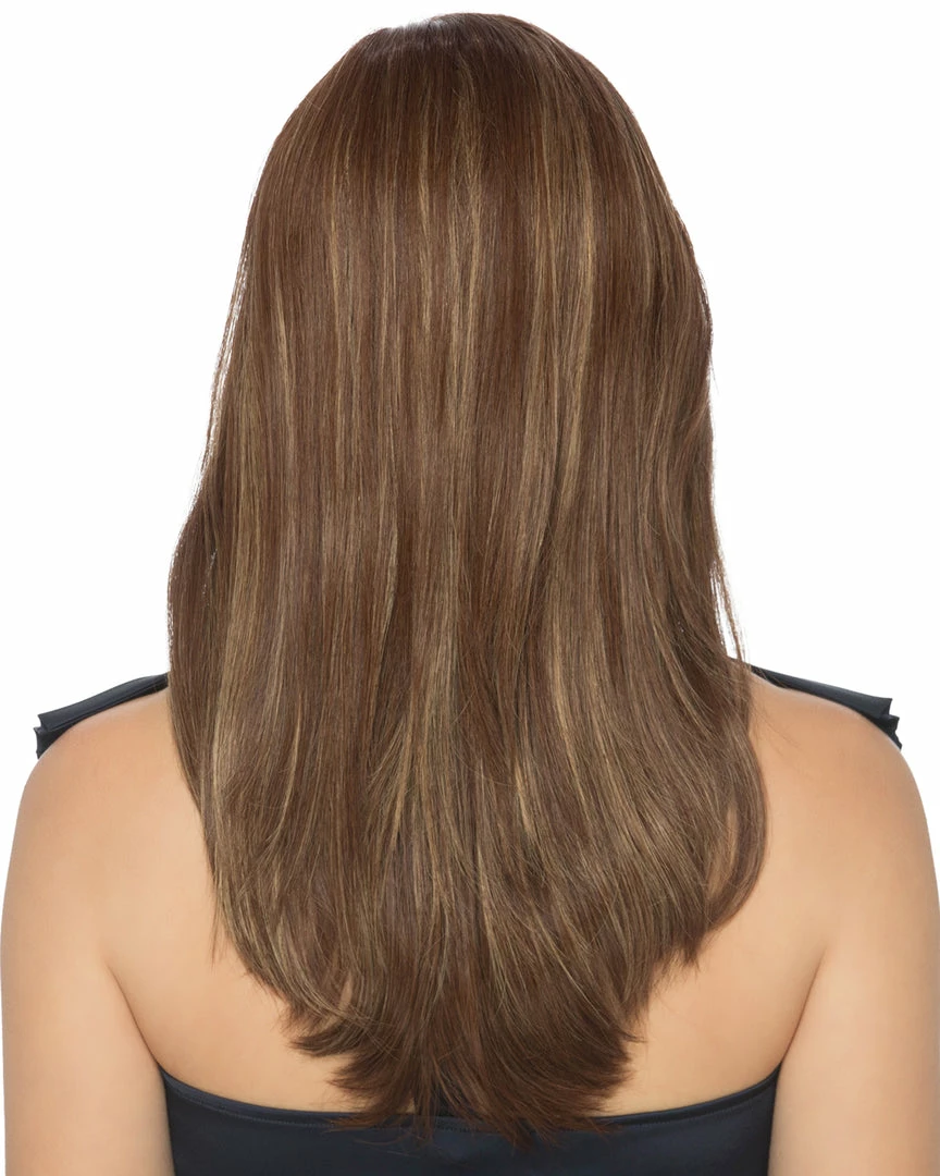 The Angelina is a mono top with machine made back wig. It is long semi-layered cut, made with 14″ remy human hair.