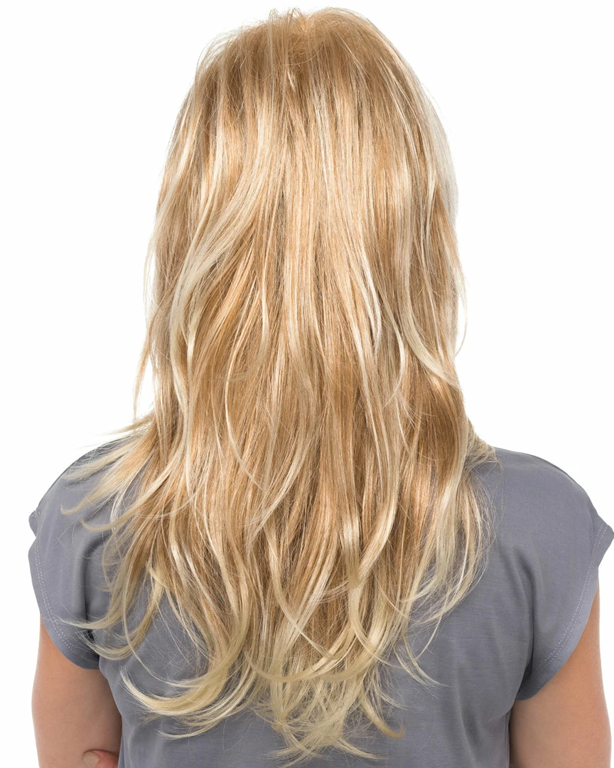 Peace by Estetica Designs is a long feathered cut with slight body wave, framing the face with bangs.