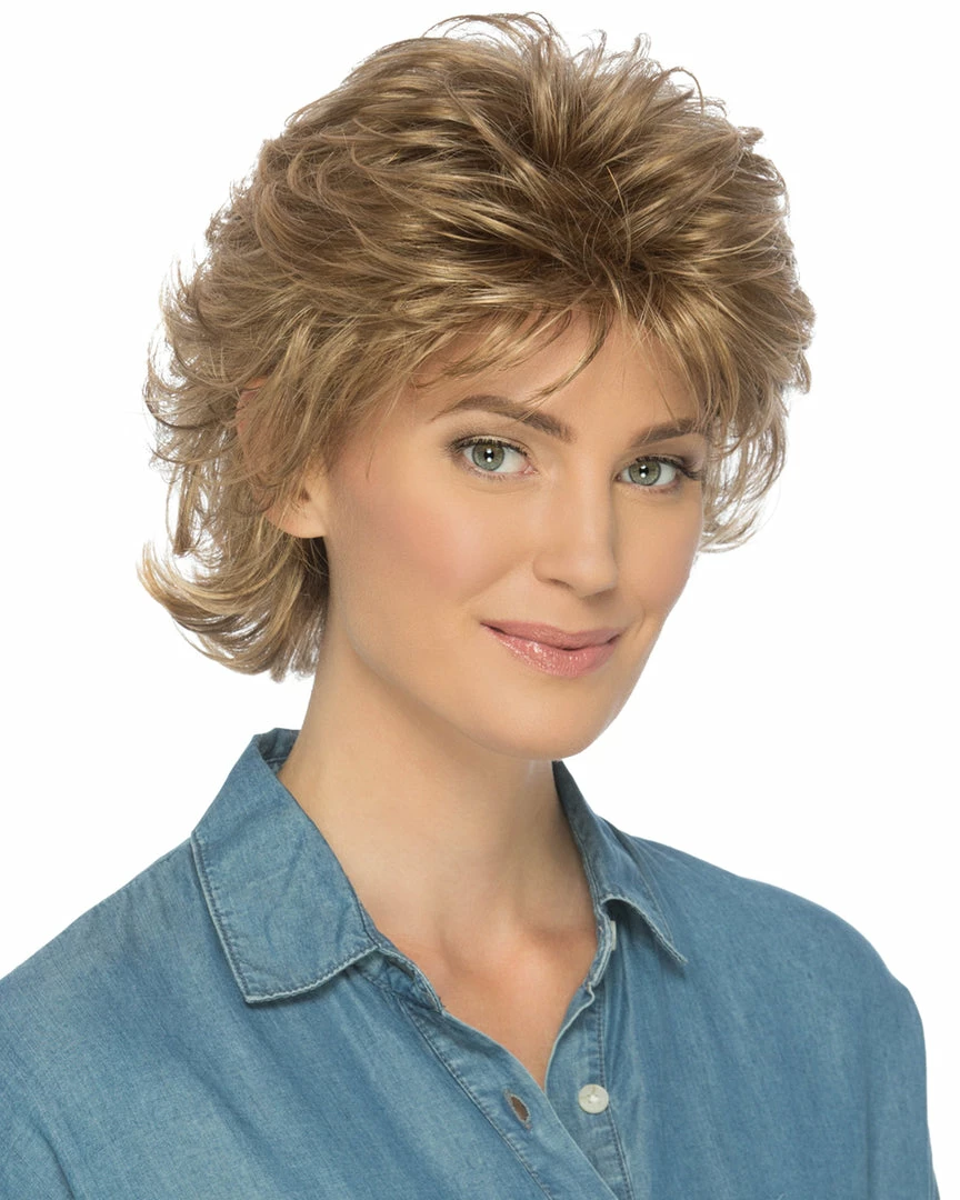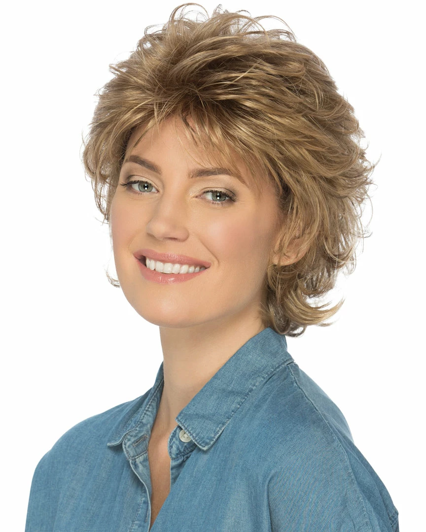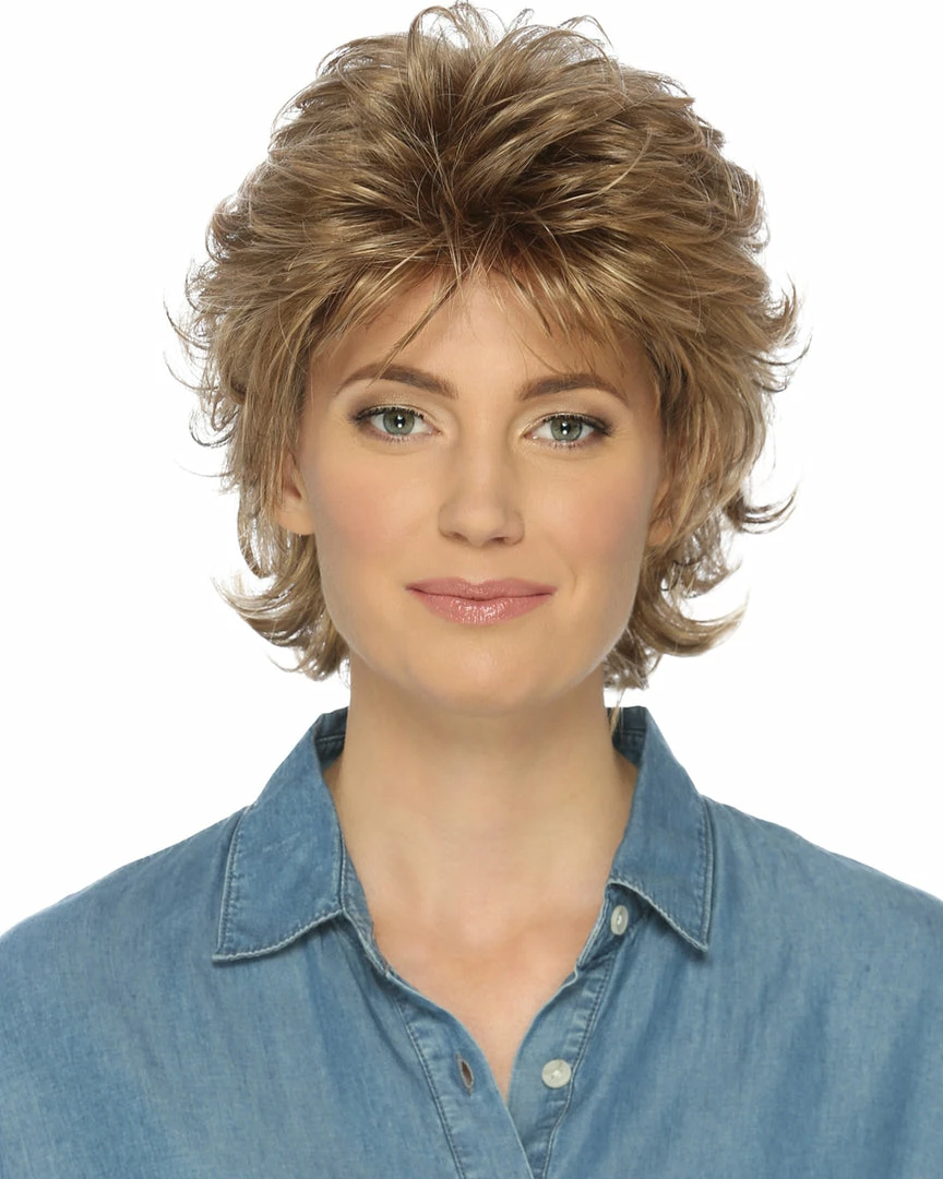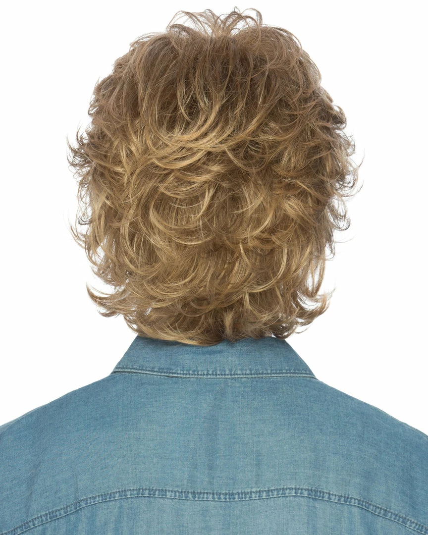 Shelby by Estetica Designs has loose curls that give this middle length shag some lift.