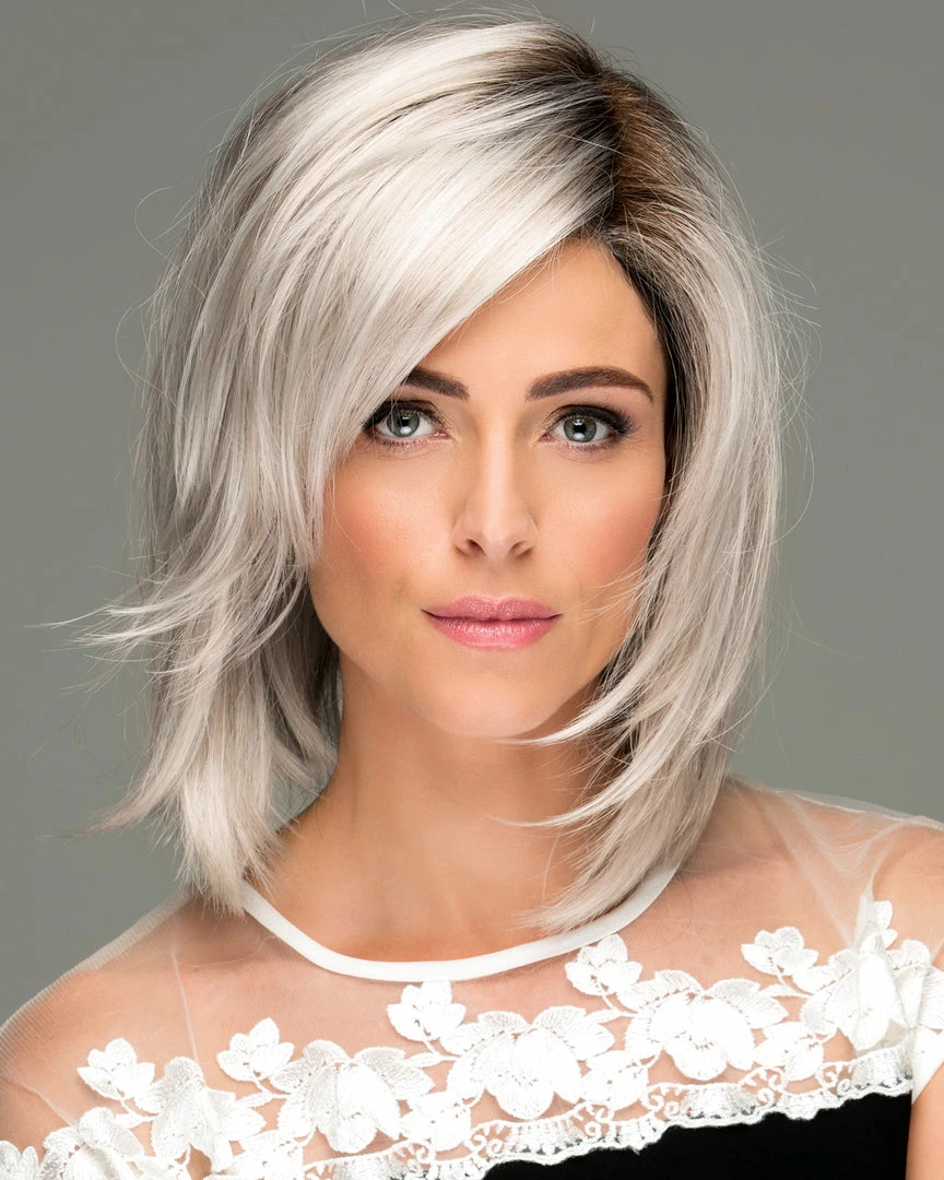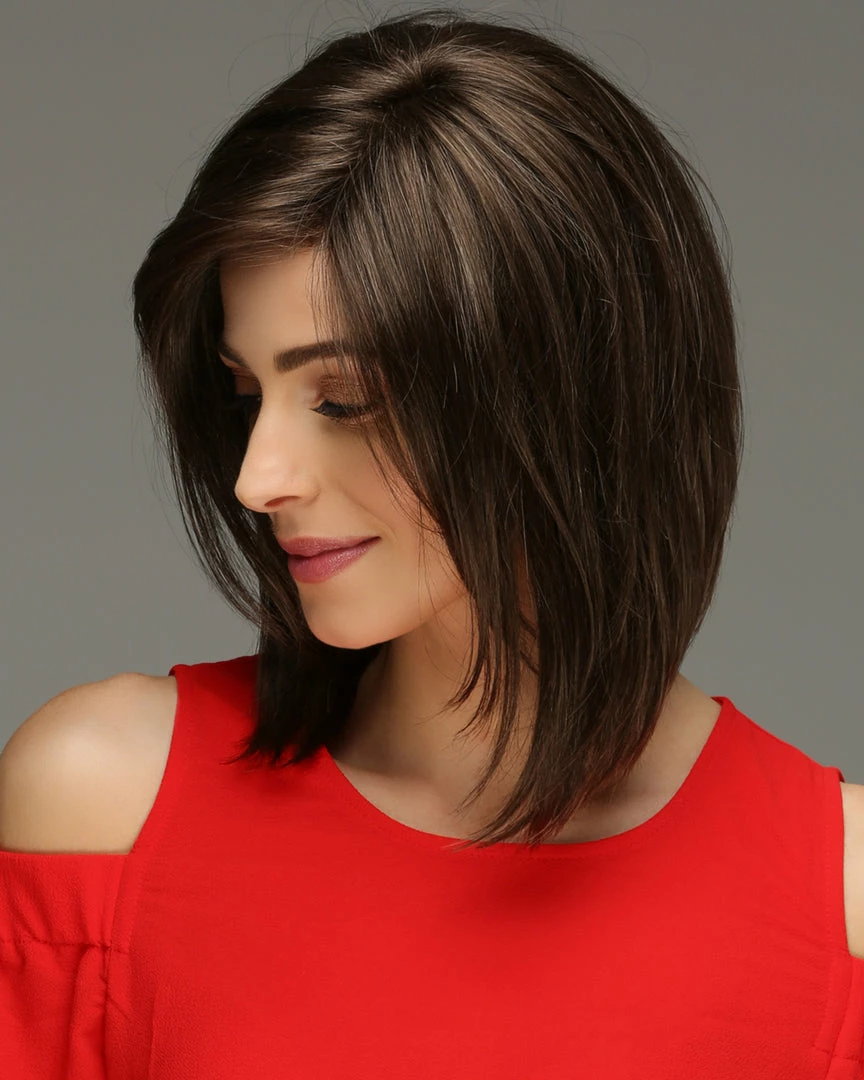 Sky by Estetica Designs is both sexy and chic; the perfect amount of versatility all in one style. Her slightly angled layers and flowing side bangs make this shoulder length style simple and sleek for a perfect evening.