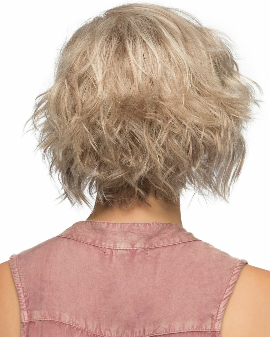 Wynter by Estetica Designs is a short, angled cut bob with long side swept bangs. Texturized waves are paired with choppy layers for an edgy, chic look.
