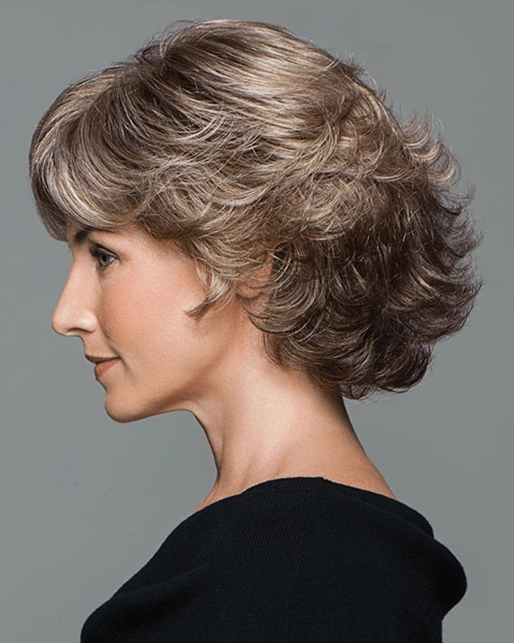 A silhouette of all-over open curled layers, this feminine, face-framing collar-length cut includes a hand tied top for light, cool comfort and a sheer scalloped hairline for off the face styling.