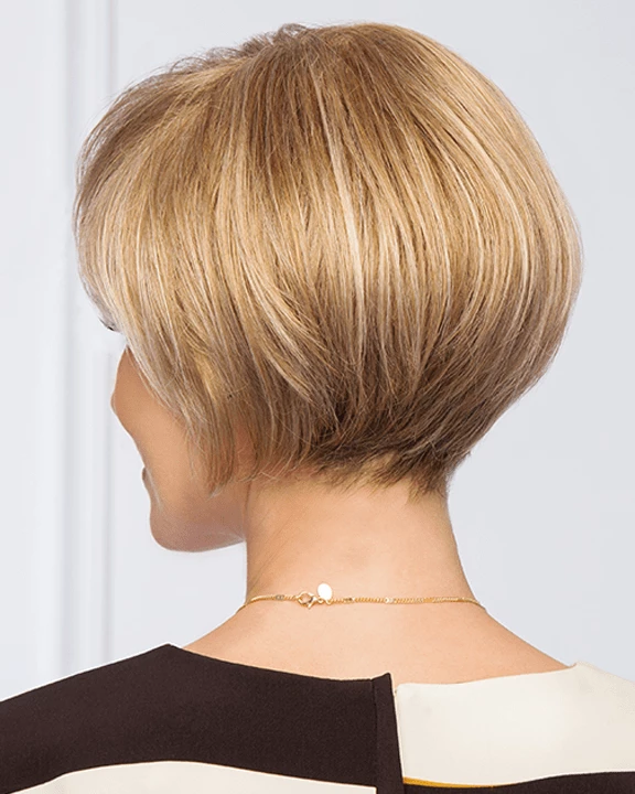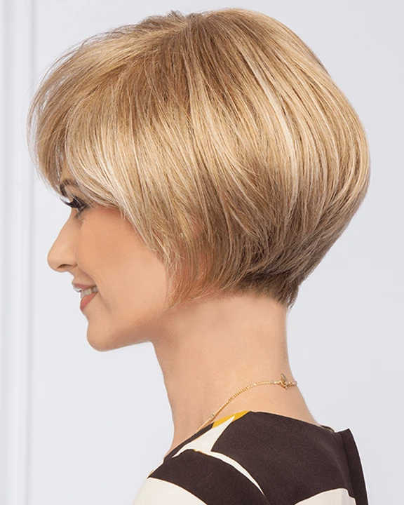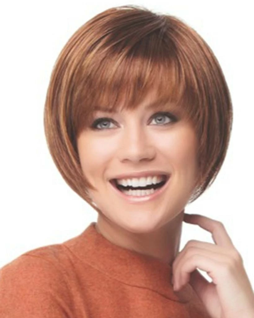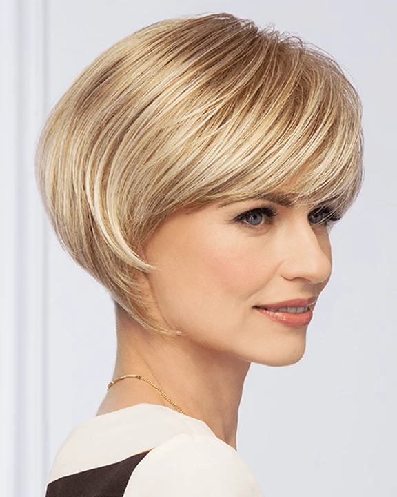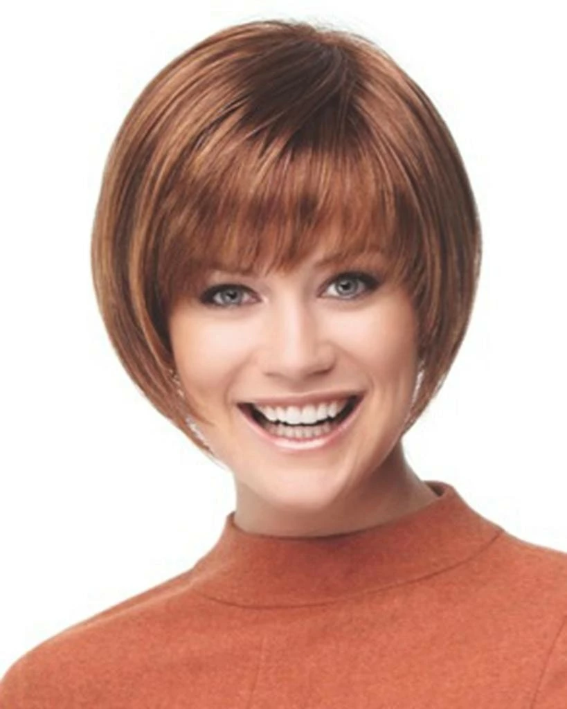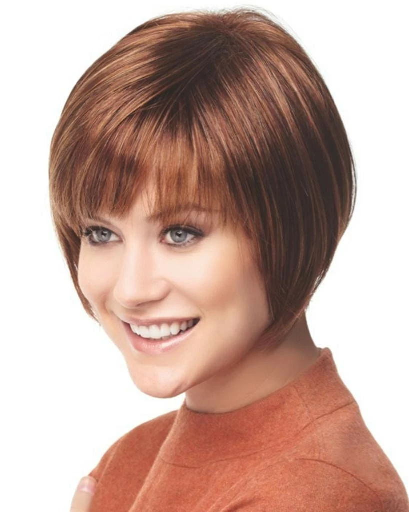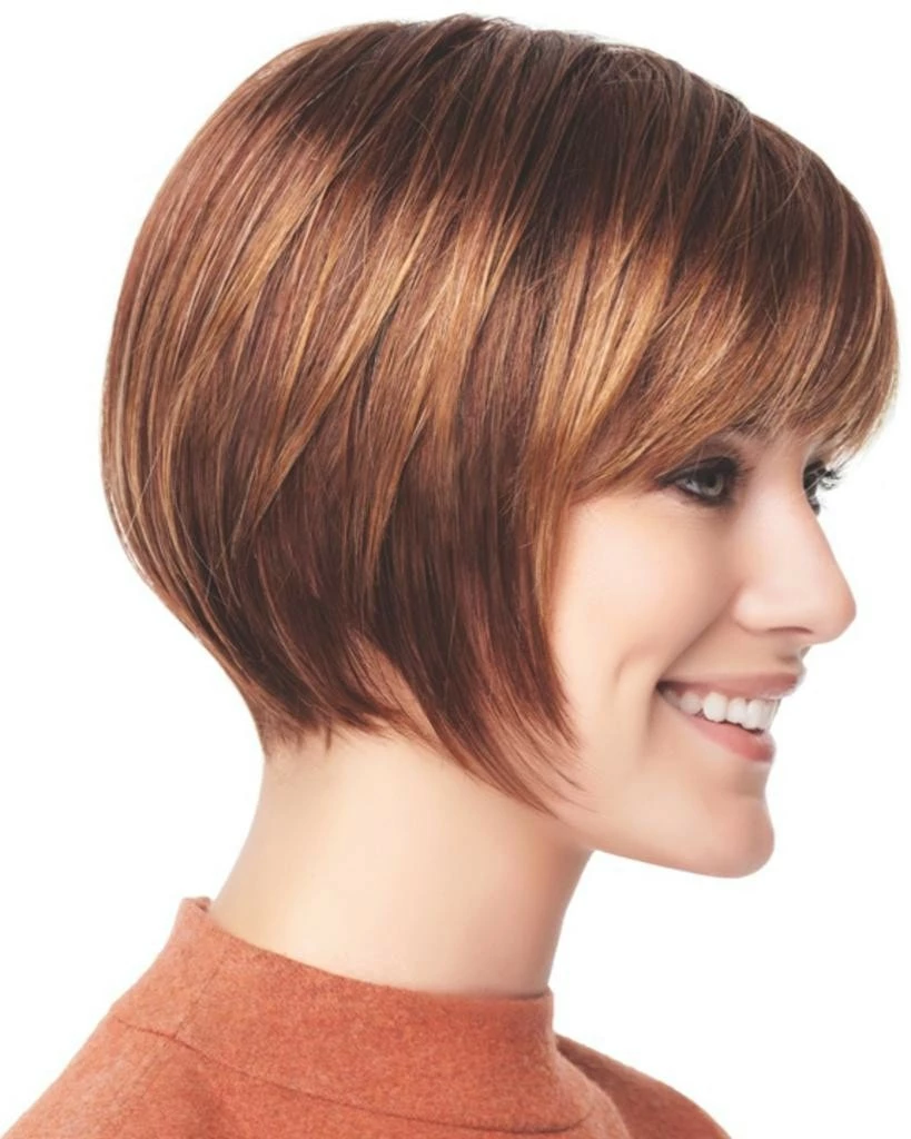 This short, smooth bob features full bangs and sleek, chin-length sides that are angled cut up to blend with a short, neck hugging nape.