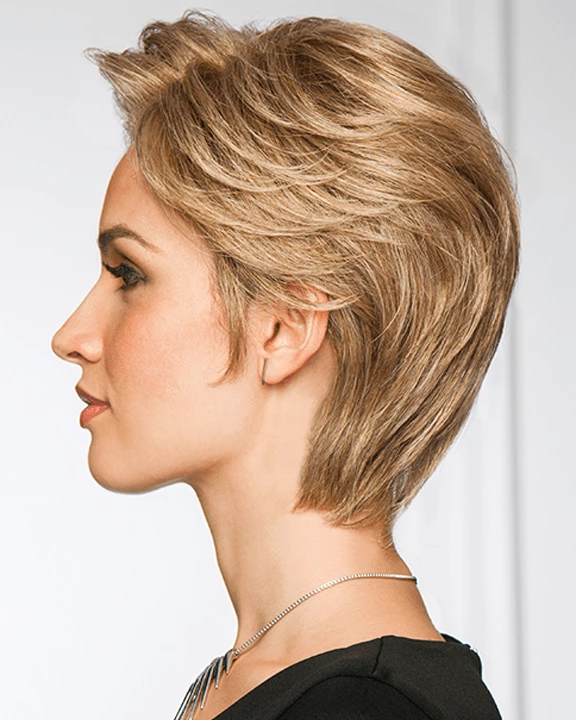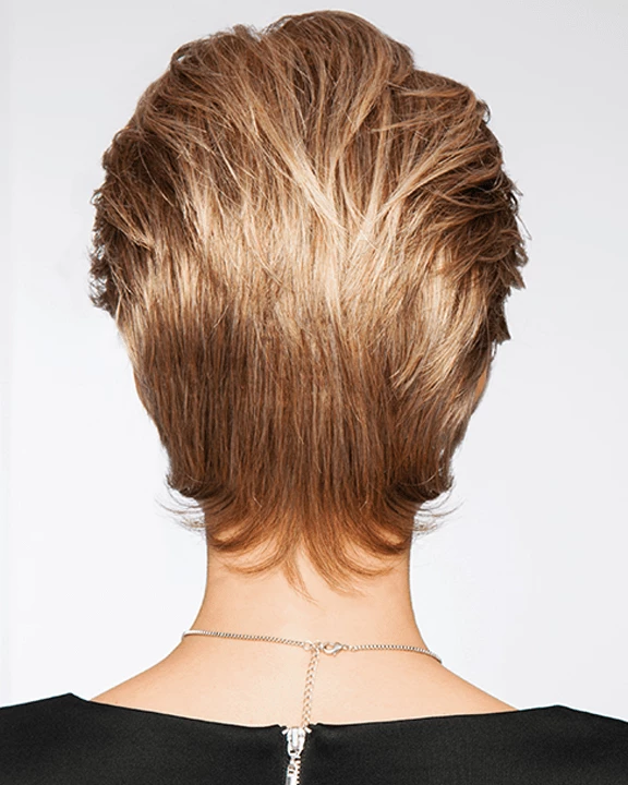 Offering generous length in the front and crown, and all over tapered layers that blend to an extended nape, this classic short cut includes an Upscale hand-knotted monofilament part for varied parting options and a sheer lace front for natural, off-the-face styling.