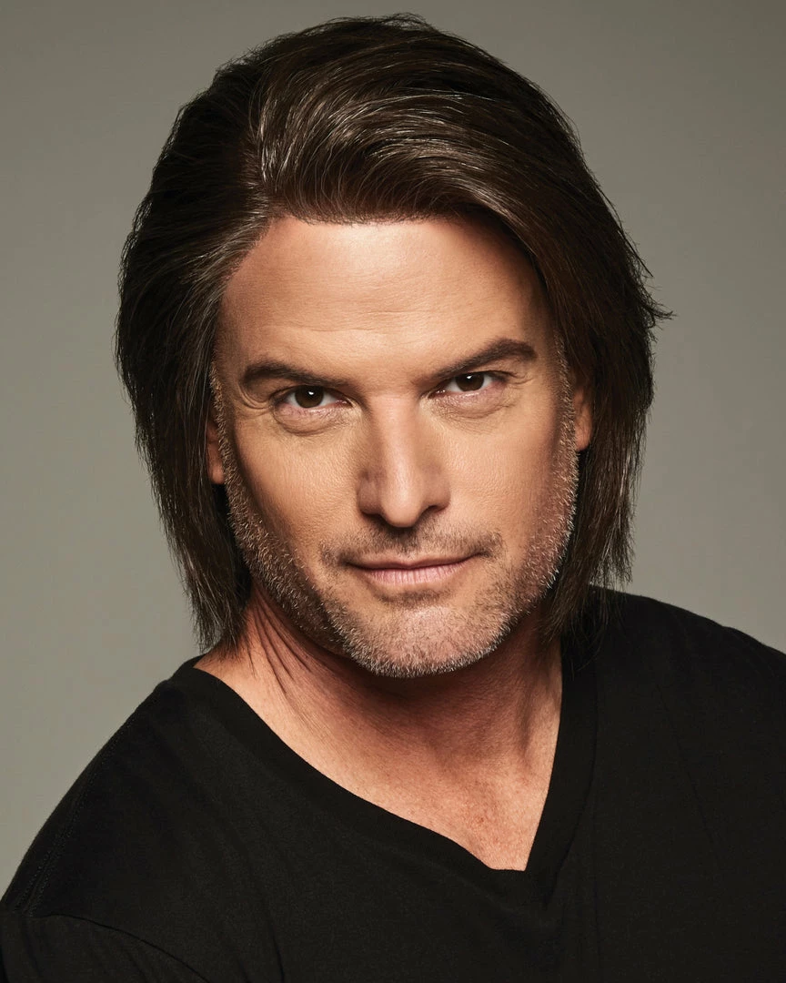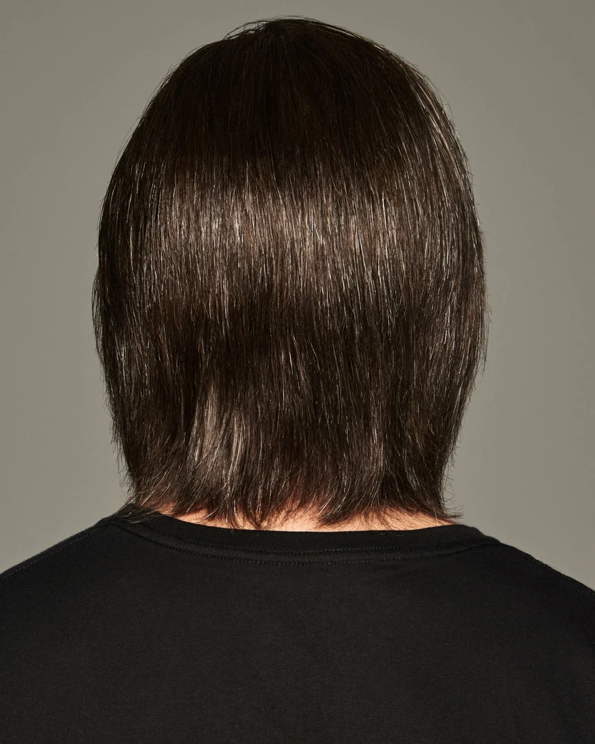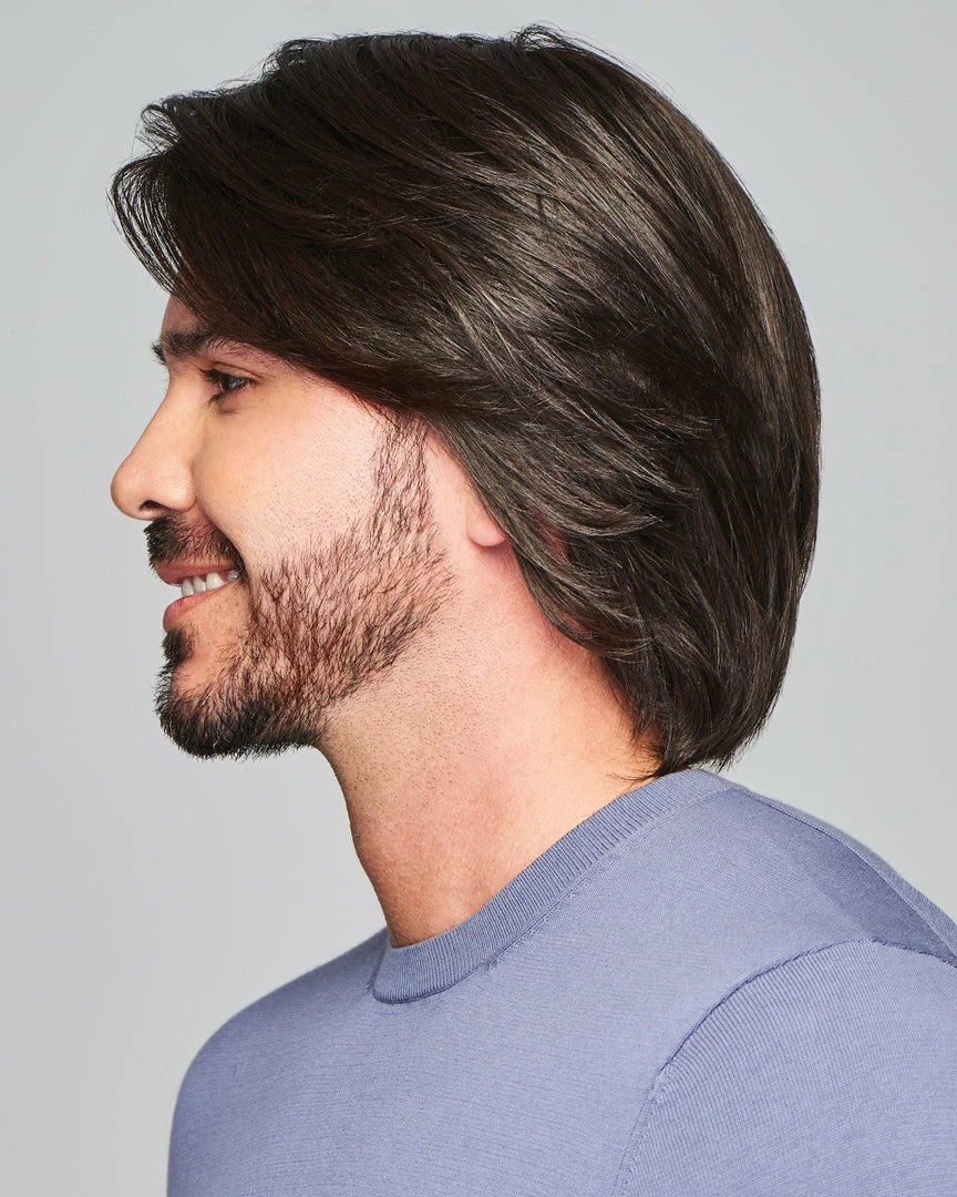 The Sharp men’s wig by HIM has added length designed to be professionally cut and customized to suit your style. Try a texturized “surfer” cut or a more “rocker” look with razor-cut layers. The artfully crafted lace front looks just like the hairline you had, while the hand-tied monofilament top allows for a multitude of parting placements. The soft, wefted cap provides a light, cool feel that’s natural and versatile.