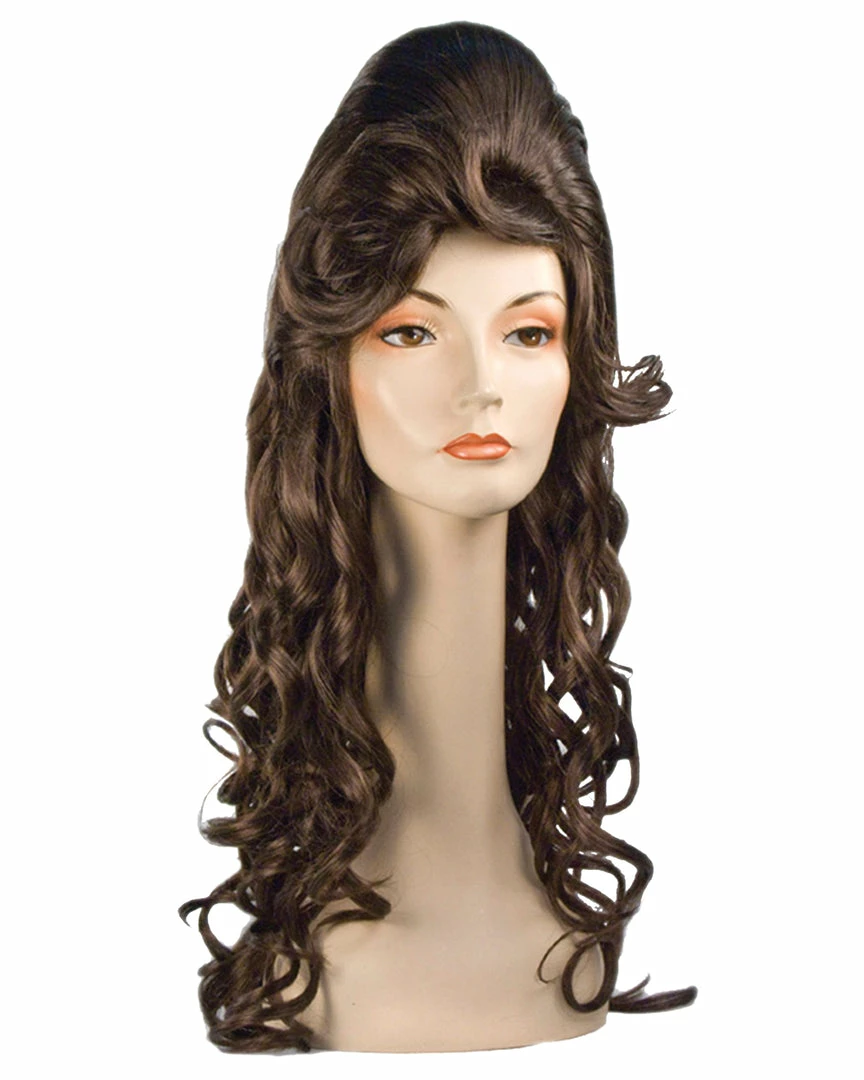 Amy Winehouse. Long black beehive with curls on the trashy side for a troubled soul. Color shown is Dk Brown, but wig only comes in BLACK