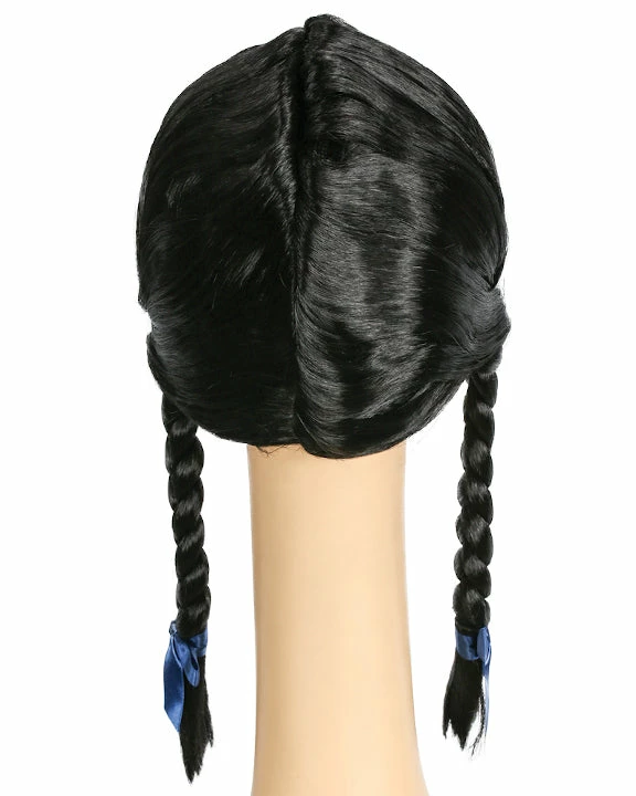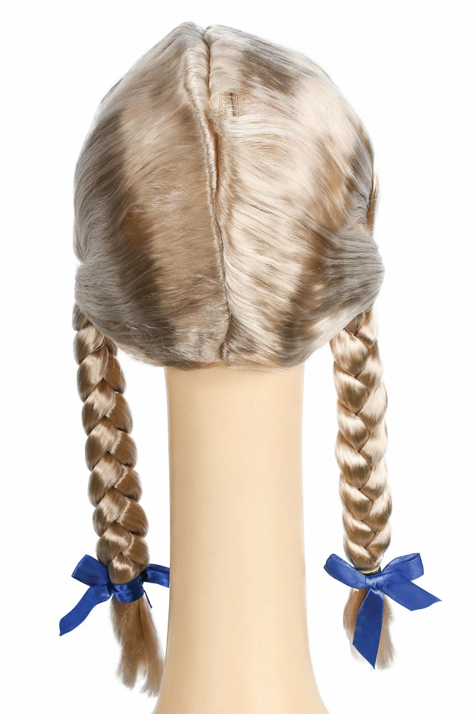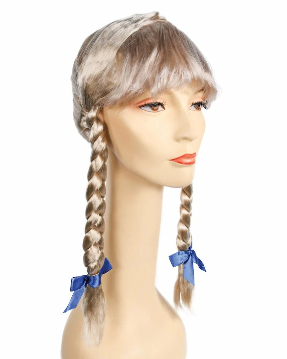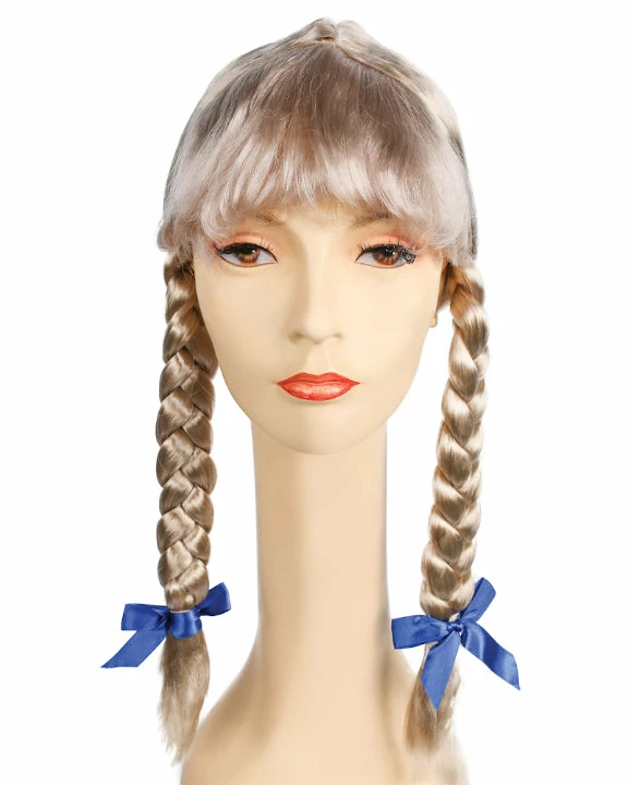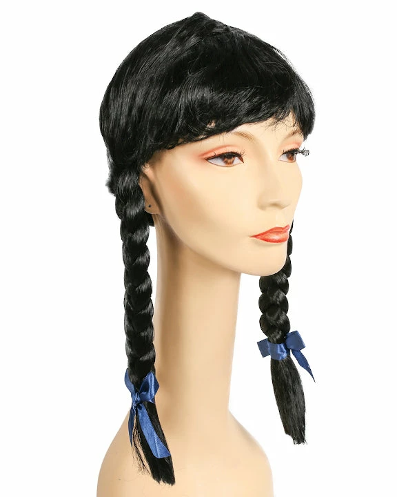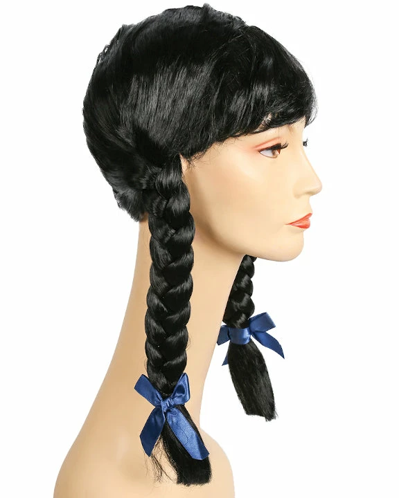 The Banged Special Bargain Braided wig has long braids with ribbons at the ends and comes with bangs, made in a less expensive fiber.