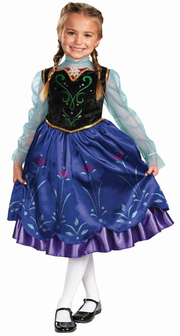 Frozen Anna Child. Transform your child into one of Disney’s most fearless princesses in this pretty Frozen Anna costume, patterned after Princess Anna of Arendelle! Lovely dress has sheer blue sleeves and a blue satin skirt with glitter flower accents and a scalloped hemline. Petticoat underneath has a purple ruffled satin border that peeps out from beneath the skirt. The black pullover vest has sequin trim and a velcro back neck closure, as does the dress.