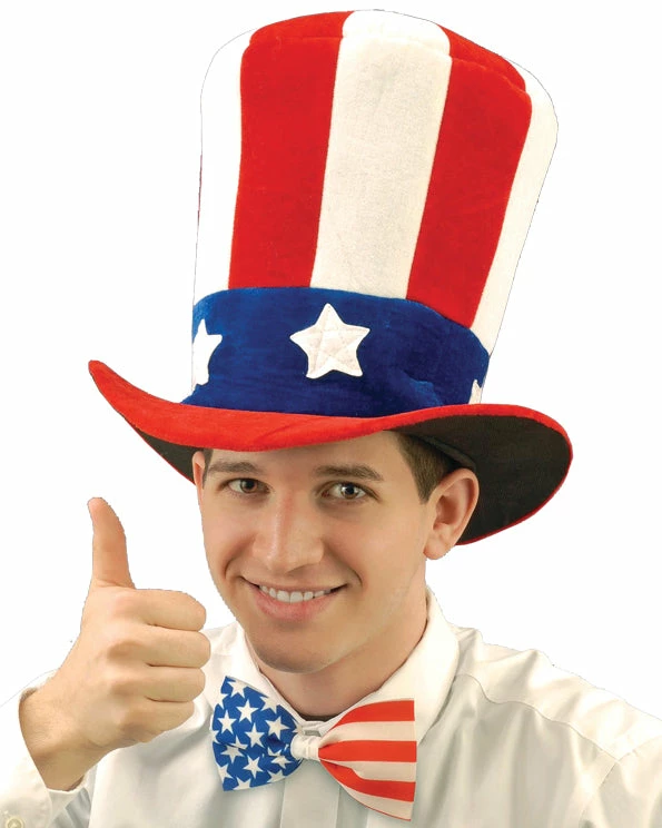 Red, white and blue top hat with star adorned hat band. Made of velveteen covered foam material, soft and comfortable to wear. One size fits most adults.
