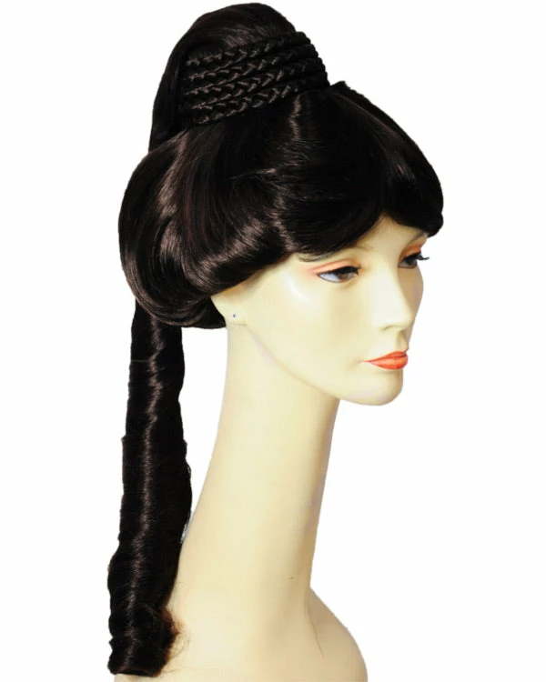 The Deluxe Jeannie Wig is a high quality synthetic wig with a Genie braid. A full wig with bangs and upswept long ponytail with braid detail around the base!