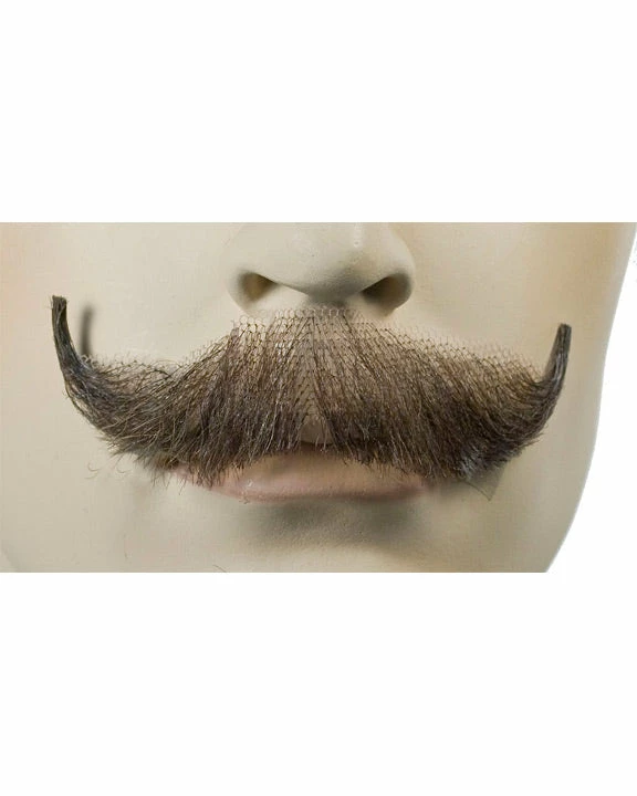 Human hair, hand tied to fine lace. Our mustaches, beards and sideburns are extremely natural in appearance. English Human Hair Handmade Mustache. (Spirit gum adhesive sold separately.) LW411