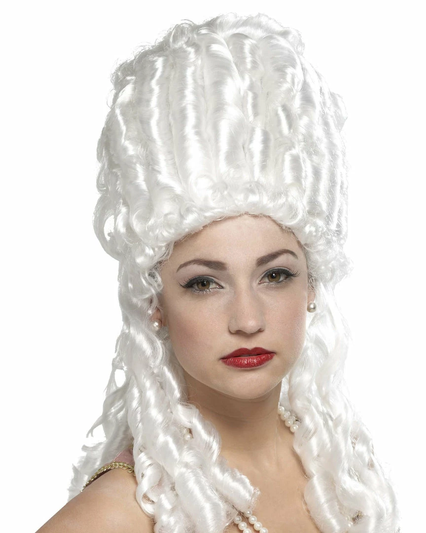 Marie Antoinette Platinum. Historical period wig with traditional high top and long curled sides.