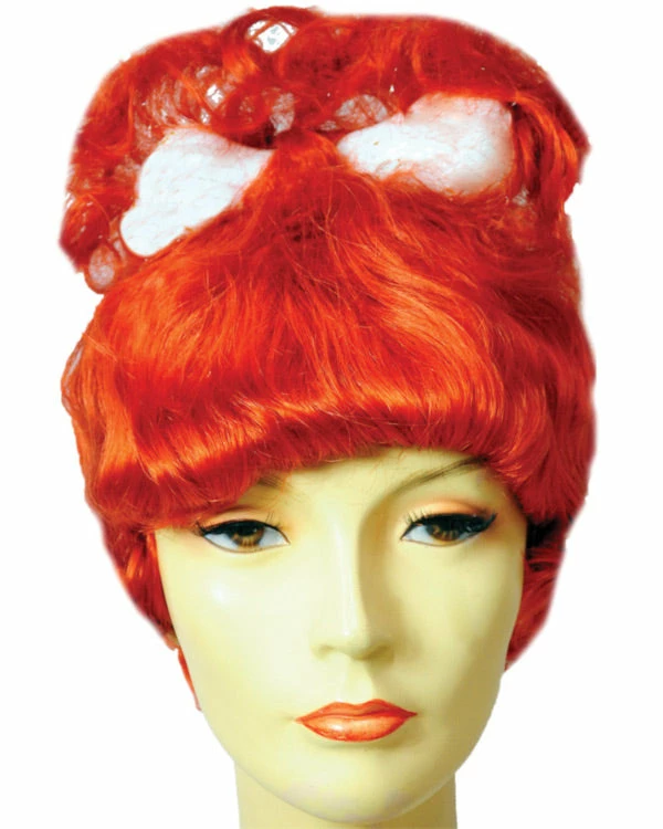 A great bright Orange short style wig with a plastic bone on the top. Similar to the style worn by Pebbles on the Flintstones. Pebbles Flintstones Pebbil Lacey Costume Wig Bone Hair