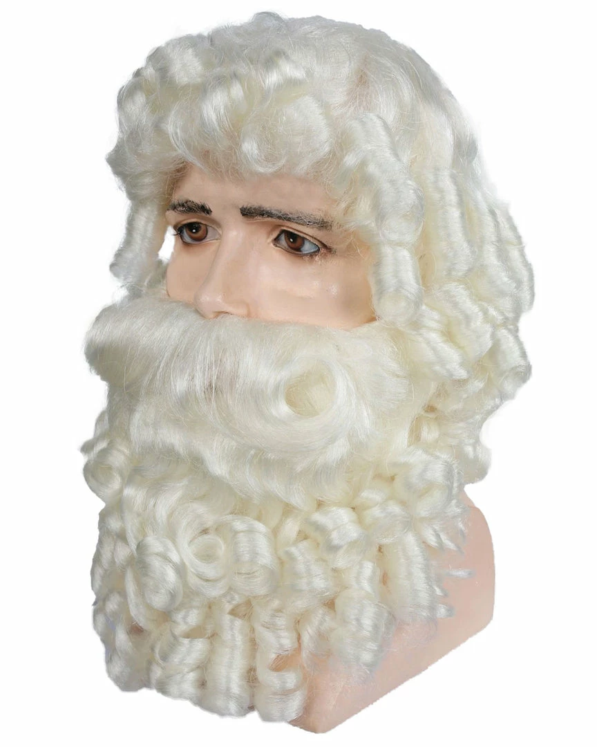 Santa Set Curly White. Some customers prefer a curlier Santa look so this wig is absolutely perfect. This wig has large banana curls, and the beard is curly too! Comes with wired mustache. Set comes boxed. LW64