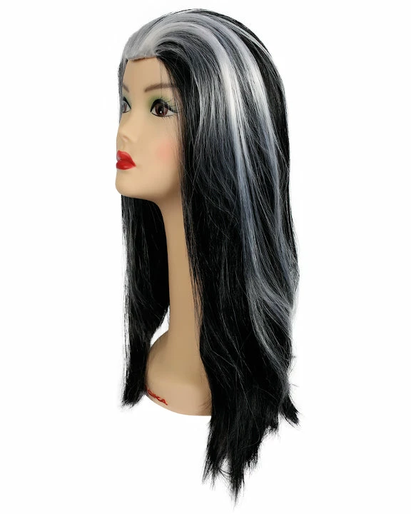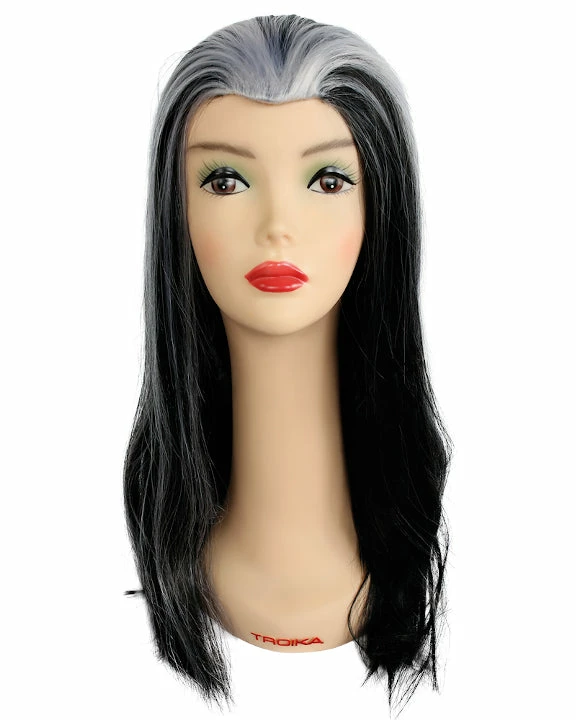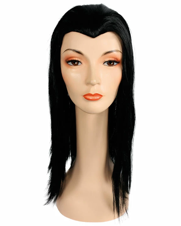 Vampira is a full and thick synthetic wig with a white streak down the center and a widow’s peak. Vampira is made with a skin top to give it the most natural appearance on stage and when styling. LW246