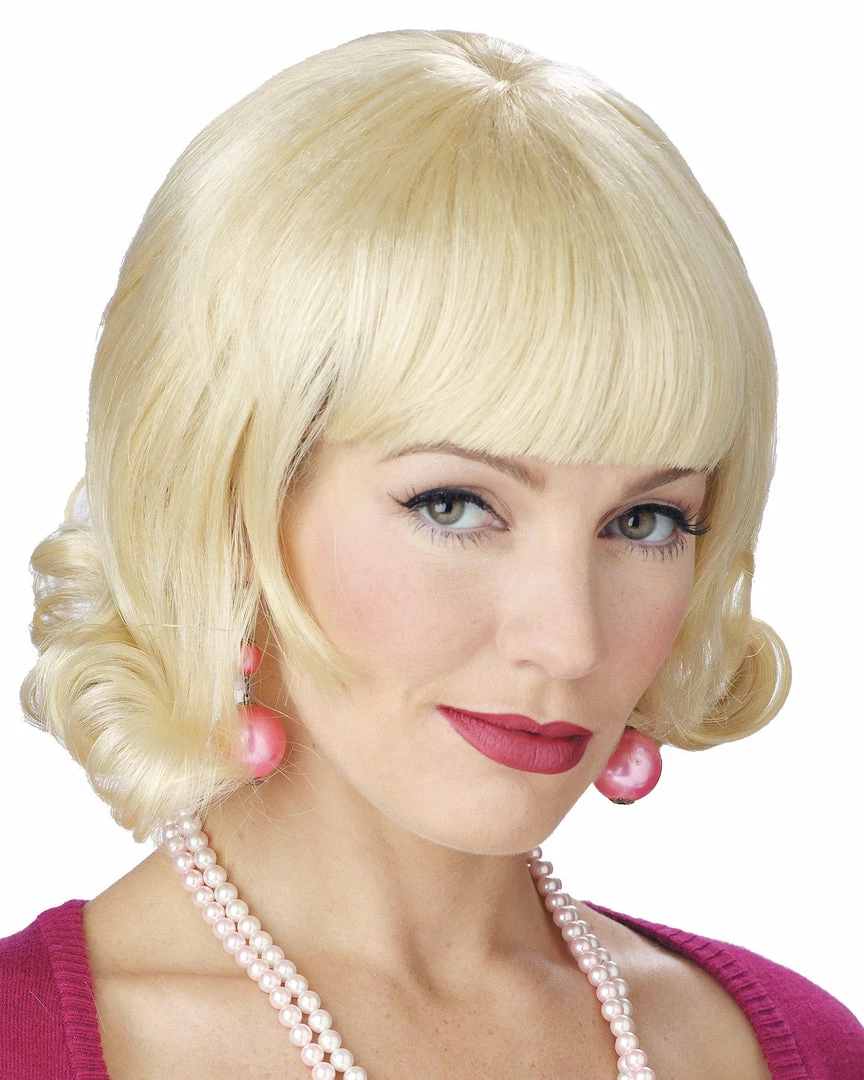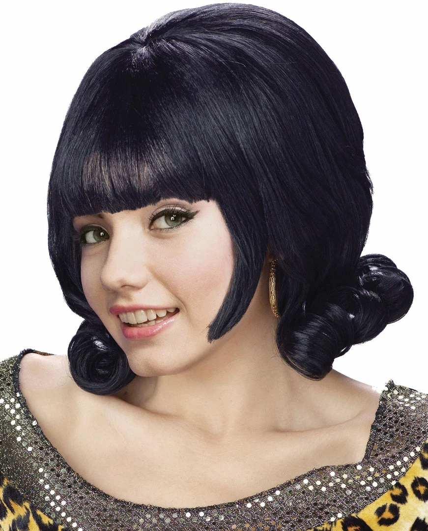 The Wig Flip. Take a walk back into the 50’s with these glamourous wigs. Flip style, long bangs with stretch net under cap. Polyblend.