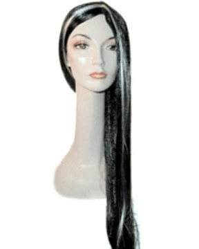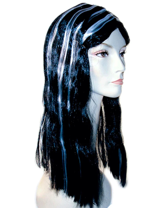 Long Bargain Vampira is a perfect Halloween style that comes in black with a white streak down the center and a widow’s peak. LW192