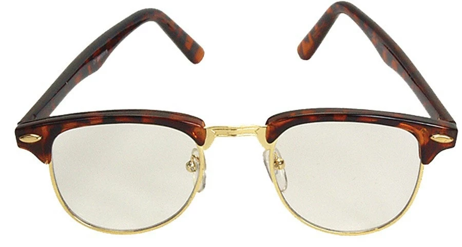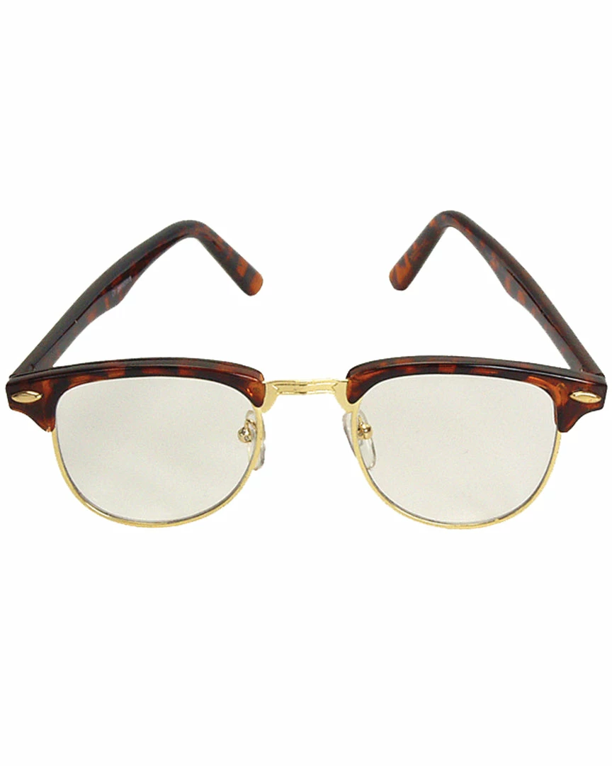 Get your “geek” on with these bold, “old-school” style horn-rimmed glasses. Tortoise-shell frames, gold bridge and rims. A look so dated that it’s hip again. Metal hinges.
