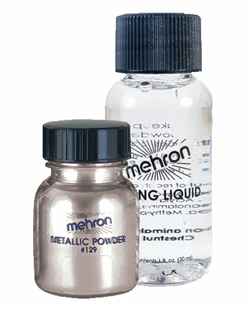 Metallic Powder Silver. Ultra-fine Metallic Makeup Powder and Mixing Liquid can be used for face painting, costume makeup, character makeup and sexy evening makeup. Use dry or combine with Mixing Liquid to form a water-based liquid makeup. Metallic Powder 0.17 oz (5gm) Mixing Liquid 1oz. (30ml) Bronze.
