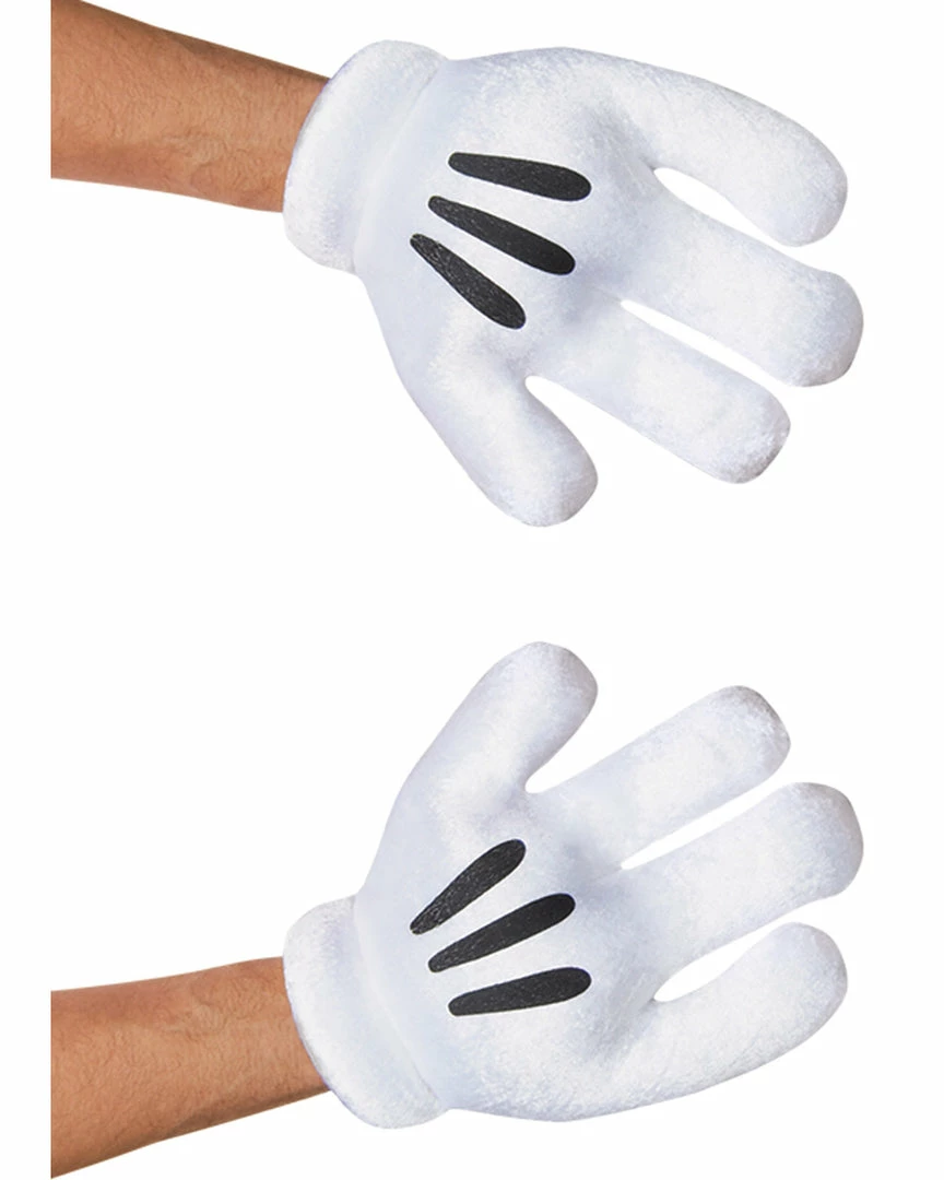 Mickey Mouse Adult Gloves. Mickey Mouse Adult Gloves have the traditional cartoon look with 4 fingers and black lines on the back. One size fits most adults.