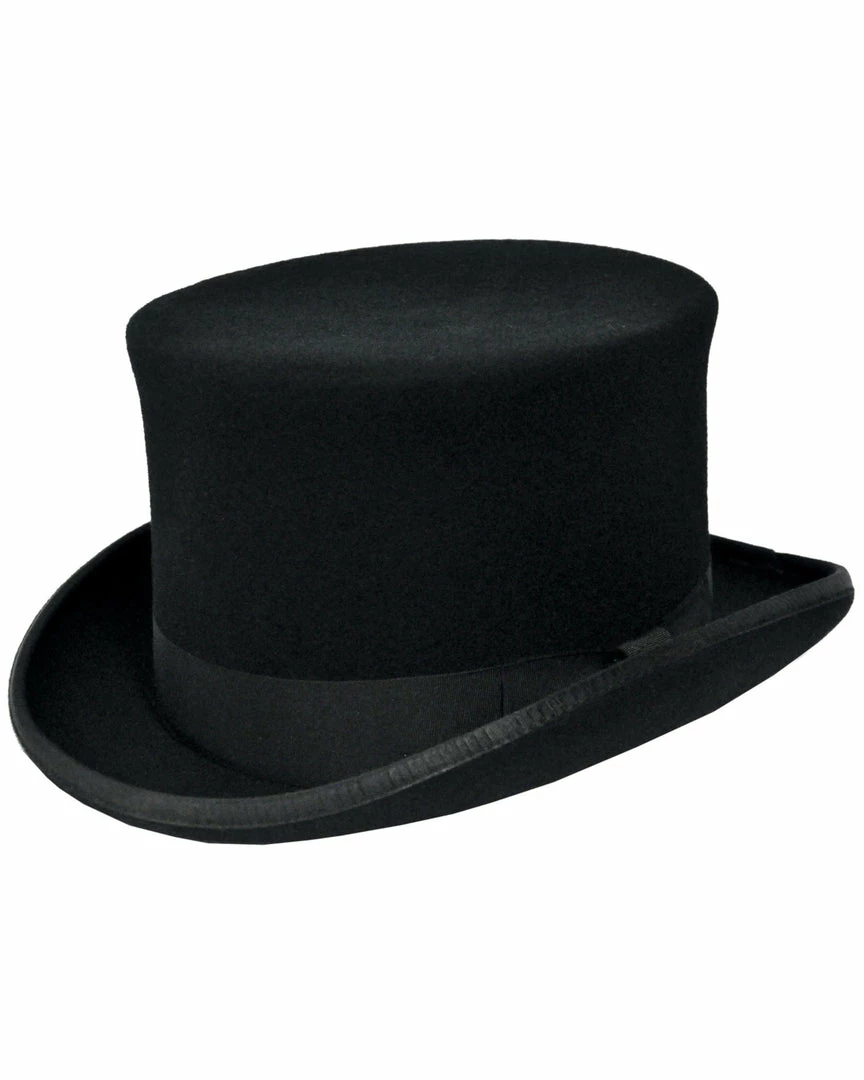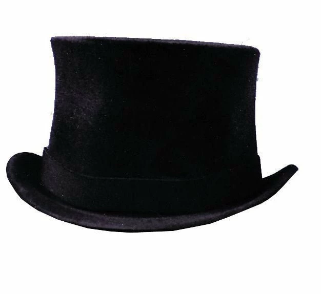 Prince Charles Top Hat. Beautiful tall black 100 percent wool top hat with satin band. Brim measures 2 inches front, 1 1/2 inches side. Height 5 1/2 inches. Hat size is 7 3/8 (Large)