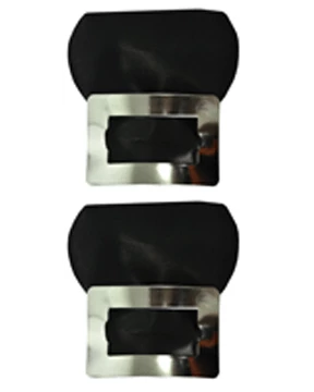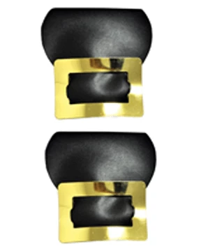 Pair of black vinyl shoe decorations that fit over the top of your shoes with an elastic strap.The vinyl part is 3.5 x 3.5 inches, and buckle is approximately 2.75 x 1.75 inches. Fits children or adults.