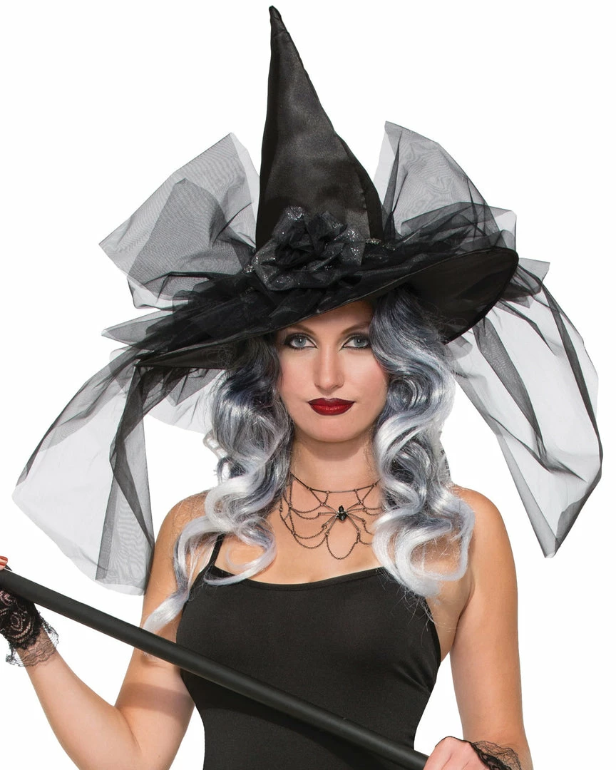 Witch Hat Fancy Deluxe. For the most elegant witch of all! Fancy Deluxe Witch Hat is made of satin with tulle trims and veil, along with a glittery band and fabric rosette. One size fits most.