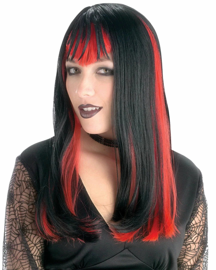 Widow Black Wig W Red. Long straight black wig with red hair accents for a very mysterious look.