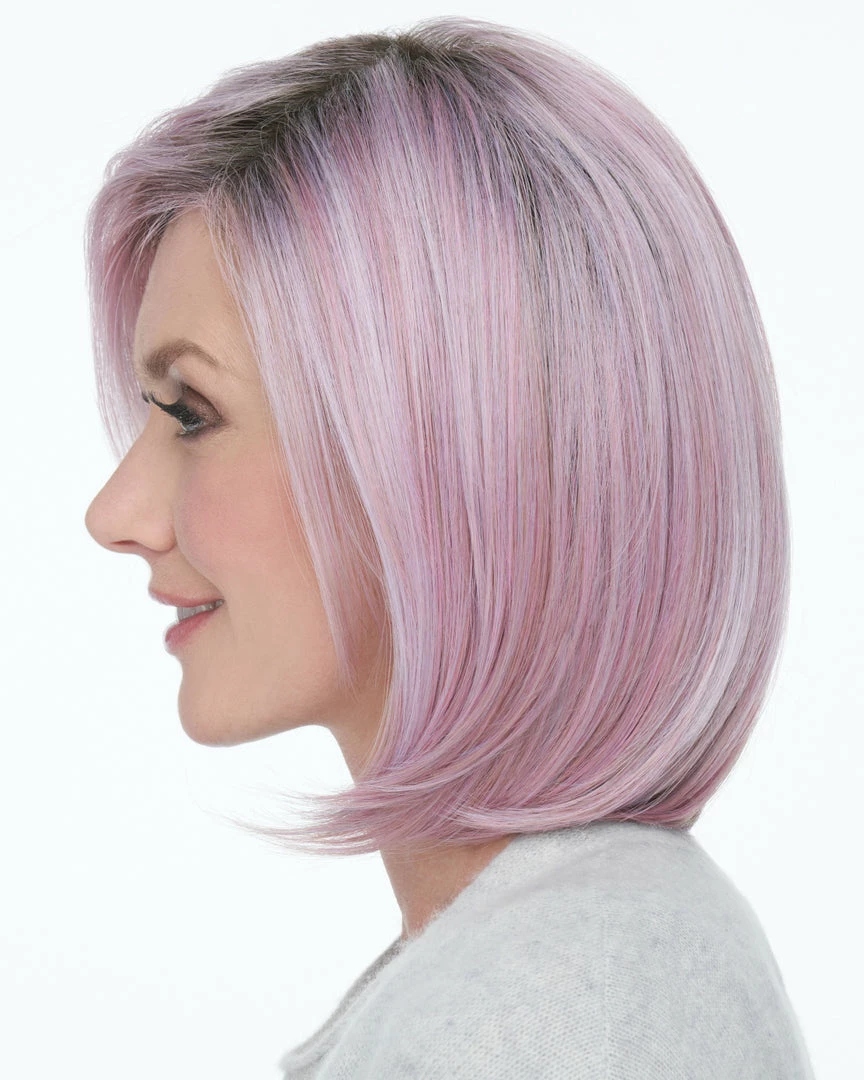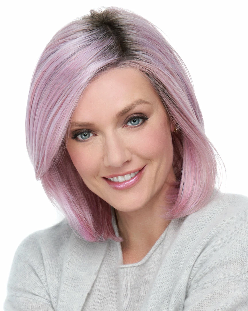 A feminine softly layered bob, Dare To Be includes tapered lengths throughout that gently fall to just below the chin, and lightly textured, side sweeping fringe that perfectly accents the eyes. The sheer lace front and monofilament top allows for off-the-face styling and varied parting options, while the dusty pink coloration reflects the latest trend in fashion hair colors.