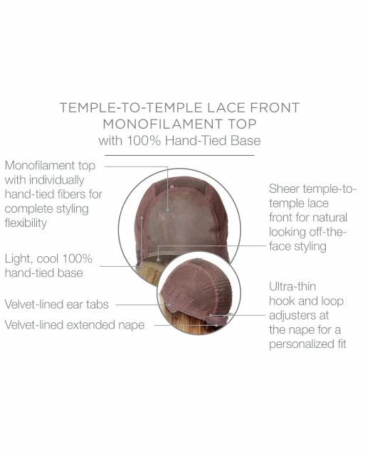Mesmerized by Raquel Welch. A classic longer look. Tailored. Polished. Like a professional blow out with a salon-quality finish. The long, side-sweeping fringe frames the face. More than smooth and glossy dream hair, it’s lightweight, comfortable and easy to wear. Confidently pull into a ponytail thanks to the hand-tied base and extended lace front.