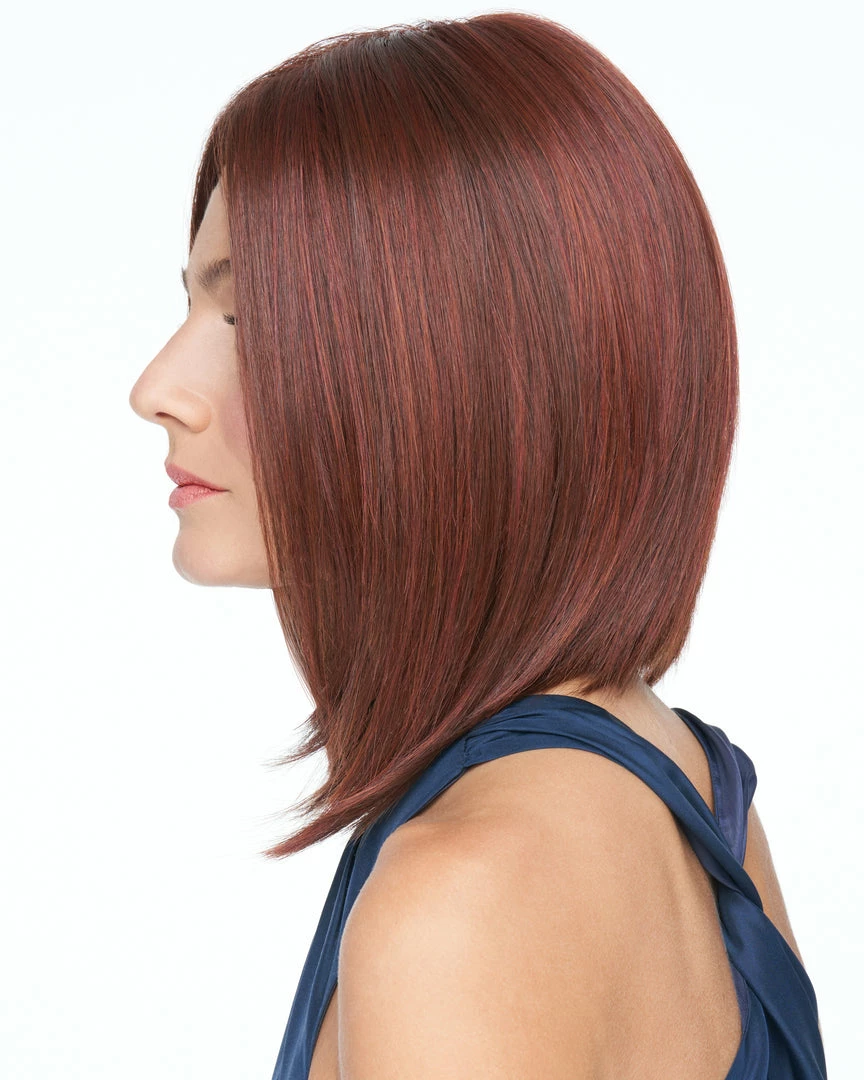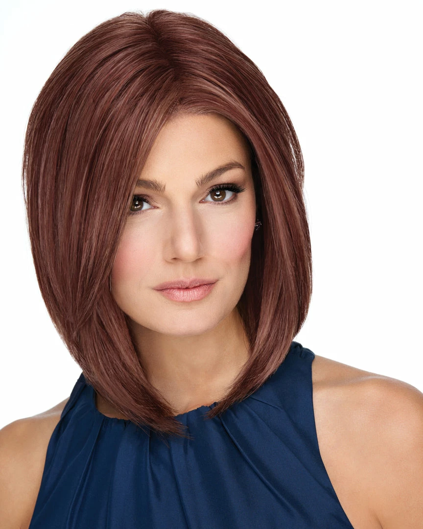 On Point by Raquel Welch. The look of the season is this angled bob. A precise razor cut, a crisp center part…slightly retro, totally timeless. A Sheer Indulgence™ temple-to-temple lace front allows the hair to be brushed toward the face or swept back, and a center placed monofilament area creates a natural middle part. This silhouette is truly a classic bob with a modern edge and contemporary parting option.