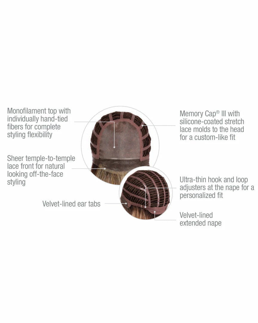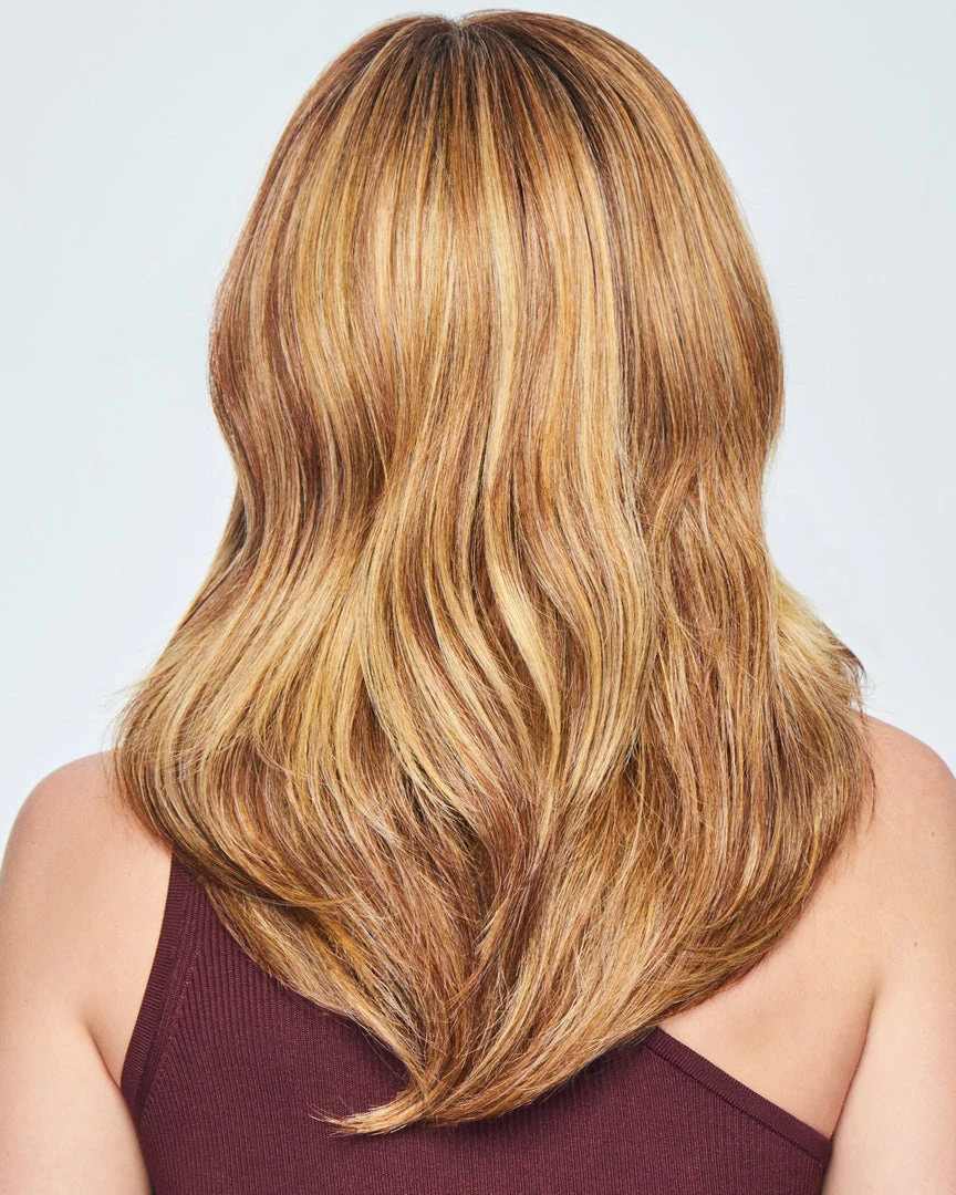 Tousled lush layers.. your invitation awaits. Unstructured. Understated. Undeniably sexy. Layered length with a natural wave is your ticket to full membership in the club where fashion is fabulous and so much fun. Try styling half-up, half down; the hand-tied top and temple-to-temple lace front offer beautiful versatility.a finger!