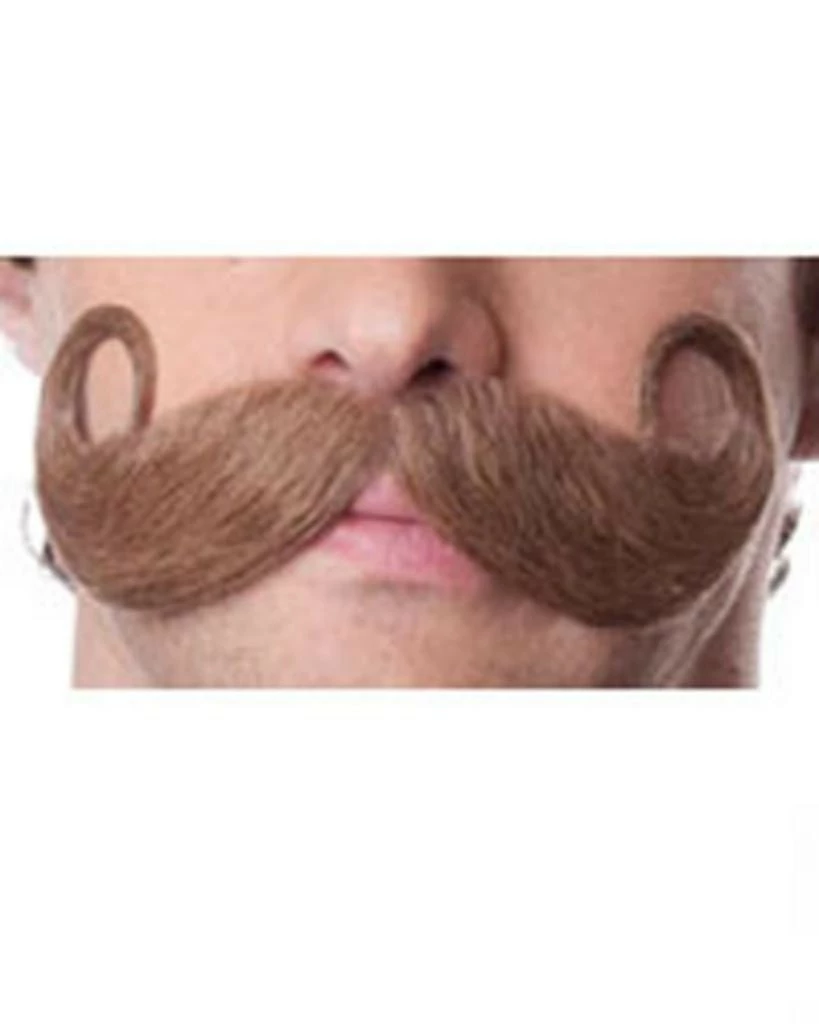 939 Big Handlebar Mustache by Sepia is made with 100% Human hair tied to a lace back. Attach with spirit gum (sold separately).