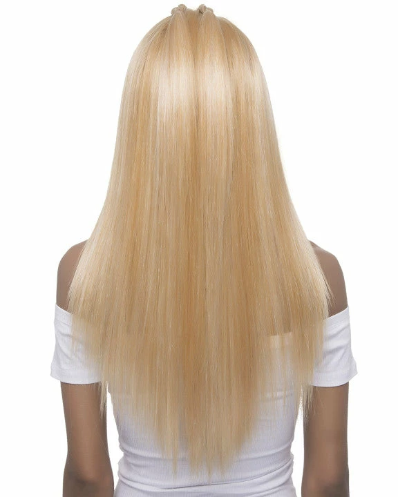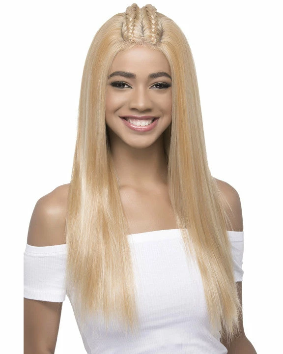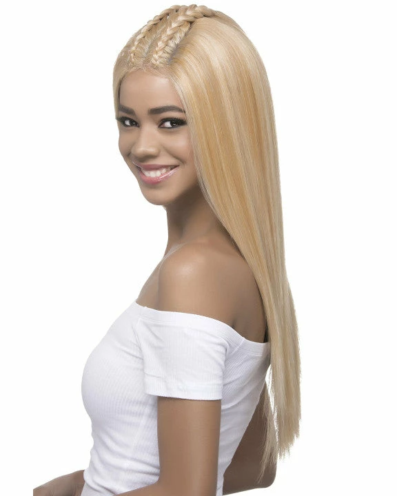 Jubilee by Vivica Fox has 26″ straight layered ends with 2 dutch braids on top.