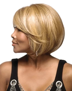 Leni V by Vivica Fox is a 10 inch classic bob style with feathered tips. Classic bob style with a swept bang makes it trendy and beautiful. It is delicately handmade with your comfort in mind. The entire cap is handtied on a light and airy mesh net that is breathable and feels natural. Hand-tied pure stretch cap stretches throughout the entire perimeter inside which gives you extra comfort for all day long without causing unwanted headache. New futura fiber helps keep the bob curl longer and bouncier.