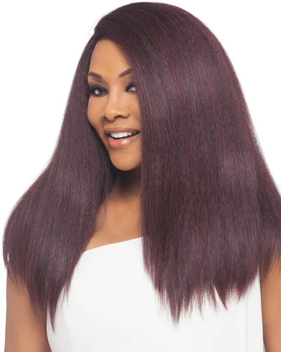 Lynn by Vivica Fox is a 20 inch wig with straight style and invisible side part. It is featured with deep lace front that is twice deeper and wider than other lace fronts and, also hand-stitched to enhance the natural look even more. Swiss lace is very soft and delicate to your forehead skin, color is very easy to blend your own skin color, and it is durable for longer lasting use. Its high heat resistant fiber not only curls well, but also keeps the style longer to make the hair look beautiful. Invisible side part makes the hair parting easier and unnoticeable so that it would look just like your own hair. Yaki texture fiber looks and feels just like your own hair.
