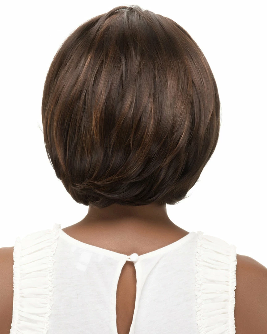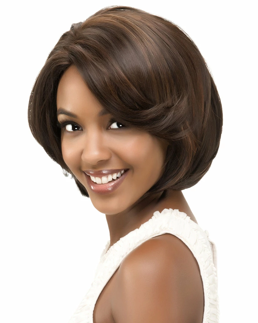 Mate by Vivica Fox is an 11 inch slanted, layered bob style with an off centered skin part. Pure stretch cap stretches throughout the entire inside perimeter which lets you wear it comfortably all day long without causing a surplus of difficulty. Its high heat resistant fiber not only curls well, but also keeps the curls made in place longer. This style is ageless and can be worn all year long. Keep others guessing and switch up your style to the class, well-put together look.
