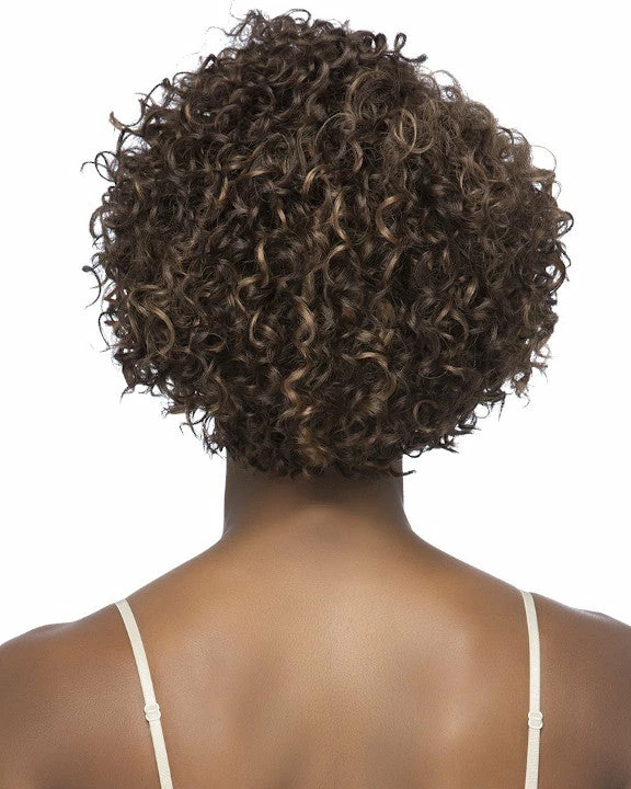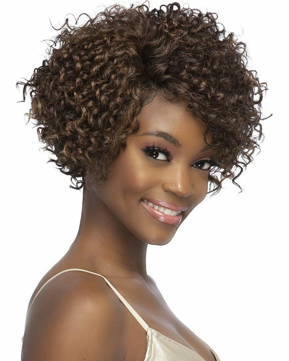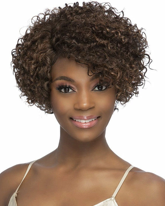 Philis by Vivica Fox is an short layered pieced spiral curl with invisible side part. Age look full of volume and curls.
