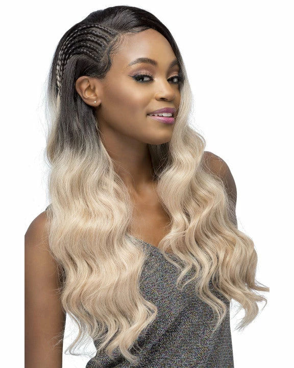 Yesica by Vivica Fox is a 26 inch layered body wave with invisible corn row braids on the side.